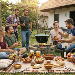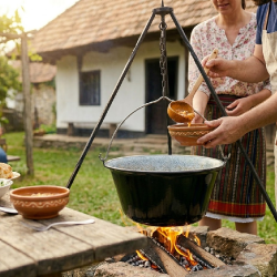 Ceaun din otel emailat, usor si rezistent, prevazut cu maner metalic pentru suspendare, ideal pentru gatit in aer liber pe foc deschis.