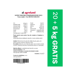 Ingrediente: Conține făină de lucernă, porumb, tărâțe de grâu, grâu, șrot, vitamine, minerale, calciu. SU 89,66%, preteină brută 16,99%, celuloză brută 10,00%, grăsime brută 3,49%, cenușă brută 8,11%, calciu 1,20%, sodiu 0,24%, fosfor 0,62%, magneziu 0,27%, seleniu 0,23 mg, zinc 58,25 mg, Vitamina B1, Vitamina A, Vitamina B, Coccidiostatic Coxiril 2%