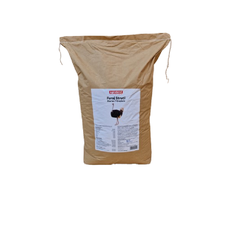 Furaj Starter pentru struț, 25 kg este special formulat pentru a asigura o dezvoltare sănătoasă și echilibrată a puilor de struț în primele faze de viață. Acest amestec complet conține proteine de înaltă calitate, vitamine esențiale, minerale și aminoacizi care susțin creșterea rapidă, oasele puternice și un sistem imunitar rezistent. Textura sa fină și ingredientele atent selecționate îl fac ușor de digerat, reducând riscul de carențe nutritive. Recomandat de crescătorii profesioniști, furajul starter pentru struț contribuie la o conversie optimă a hranei și la o dezvoltare uniformă a lotului. Ambalat în sac de 25 kg, produsul este ideal pentru fermele care doresc performanță și calitate constantă. Alege furajul starter pentru struț și oferă puilor tăi cel mai bun început pentru o creștere sănătoasă și productivă.
