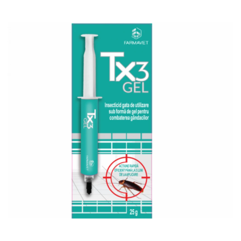 TX3 GEL este un insecticid inovator, gata de utilizare, sub forma de gel, creat pentru combaterea principalelor specii de gandaci, atat nimfe, cat si adulti, indiferent de sex. Formula sa actioneaza ca o momeala foarte atractiva datorita substantelor hranitoare bine echilibrate, ceea ce o face extrem de gustoasa pentru gandaci si asigura o mortalitate ridicata in primele 24 de ore de la aplicare. Produsul elimina infestarea in aproximativ o saptamana.