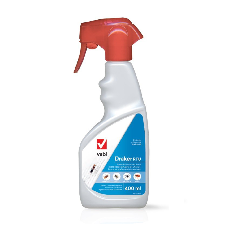 Draker RTU este un insecticid microincapsulat gata de folosire, eficient in eliminarea insectelor zburatoare (muste, tantari, viespi) si taratoare (gandaci, furnici, paianjeni), oferind protectie atat in interiorul cladirilor, cat si in exterior.