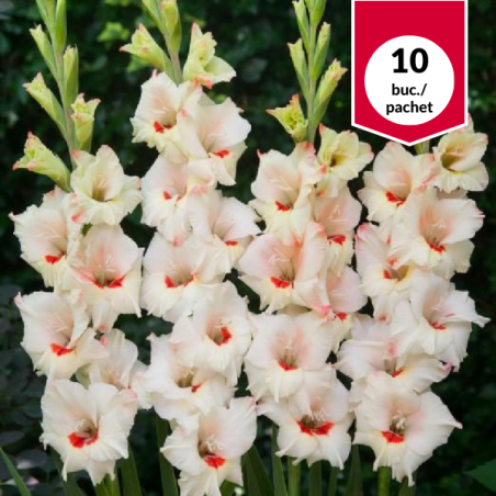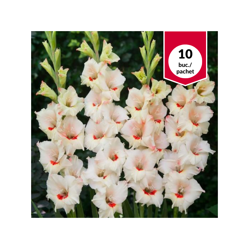 Bulbul se planteaza in perioada aprilie-mai. Gladiola va inflori in perioada lunilor iulie-septembrie. Are tulpina lunga deci poate fi folosita in buchete. Are flori albe cu pata rosie, delicate, cu miros atenuat. Pachetul contine 10 bulbi.