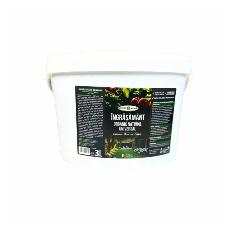 Ingrasamantul universal organic pe baza de gainat de pasare este un produs natural, prezentat sub forma granulara, ideal pentru culturile de legume, flori si gazon.