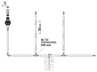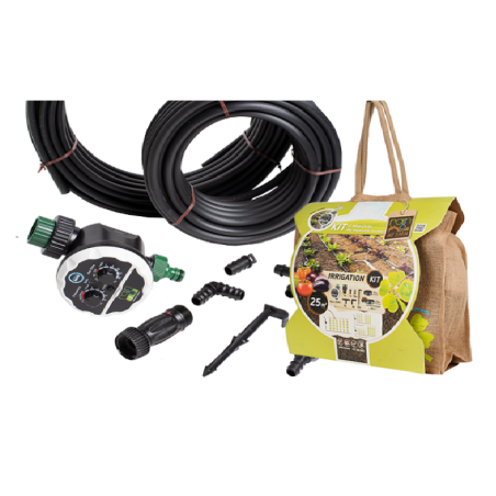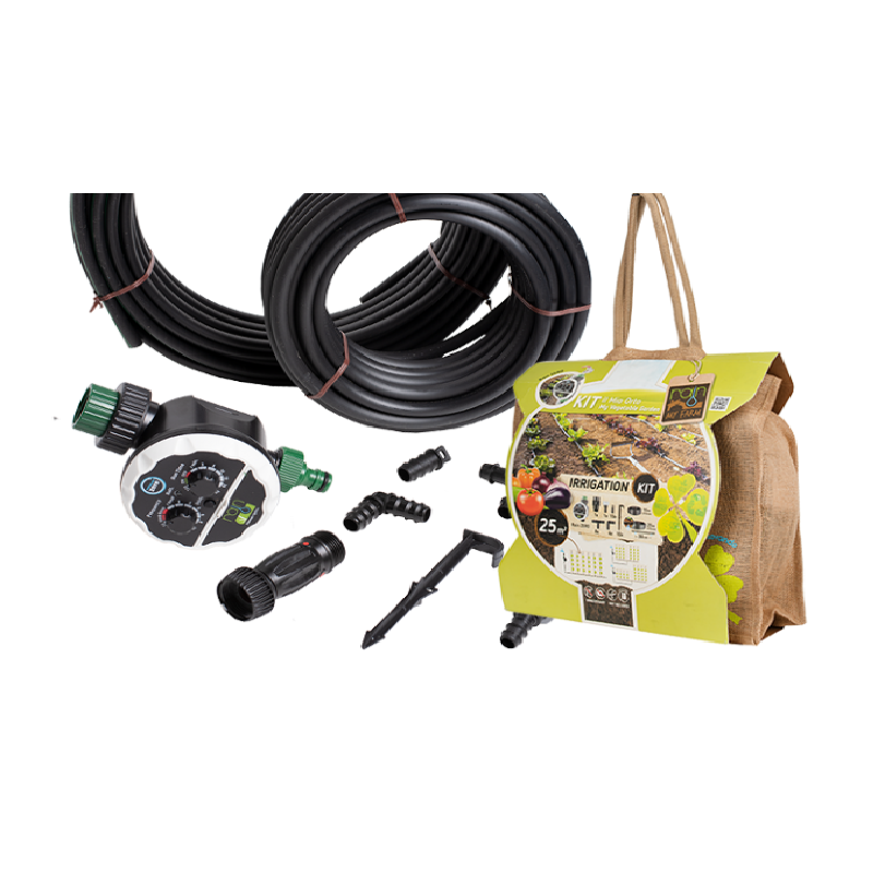 Kitul de irigare My Farm Vegetable Garden include toate produsele necesare pentru a va construi singuri un sistem de irigare prin picurare destinat legumelor, florilor sau altor plante, pe o suprafata de pana la 25 mp.