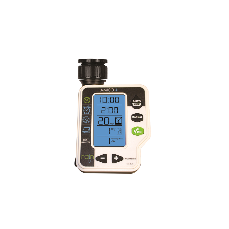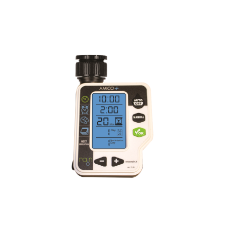 Amico+ este unul dintre cele mai usor de utilizat programatoare de irigare, apreciat inca de la lansarea sa pe piata in 2015. Setarea se face rapid, in doar 3 pasi simpli: ora de pornire, durata udarii si frecventa de irigare. Se monteaza la un robinet dublu serviciu si poate controla una sau doua zone, in functie de model. Este o alegere potrivita pentru gradini mici.