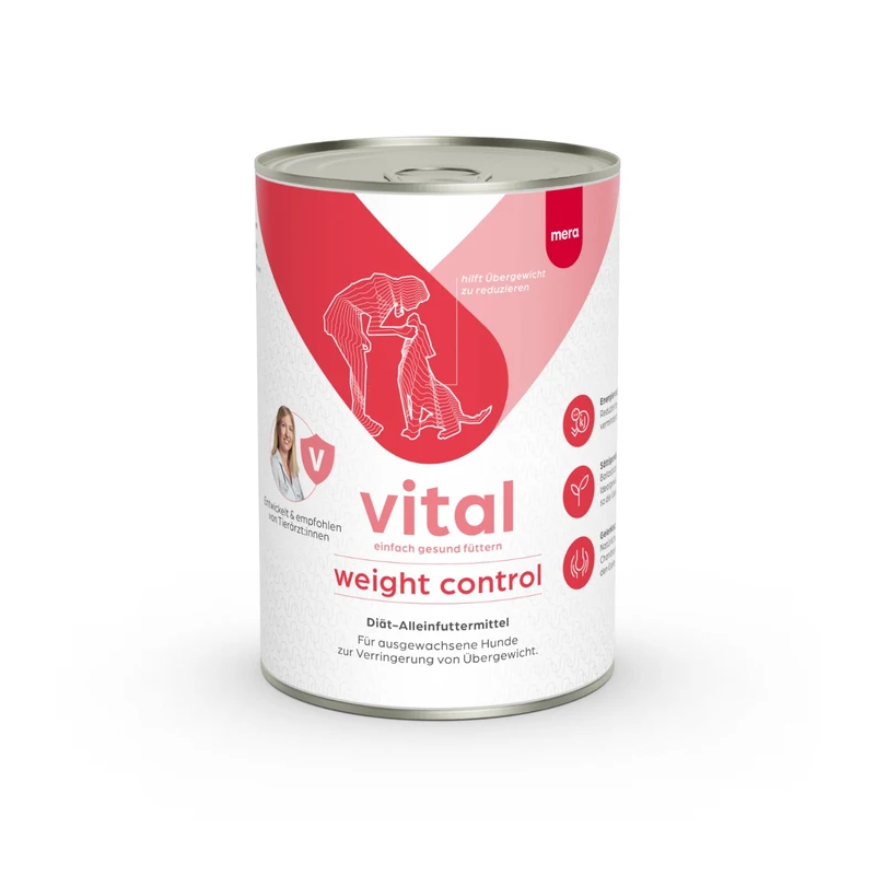MERA Vital Dog Diet este o hrana umeda dietetica completa, destinata cainilor adulti care au nevoie de sustinere in procesul de slabire sau pentru mentinerea greutatii corporale optime. Cu o reteta conceputa special pentru reducerea greutatii, aceasta conserva contine ingrediente echilibrate energetic si bogate in fibre, oferind satietate fara exces caloric.