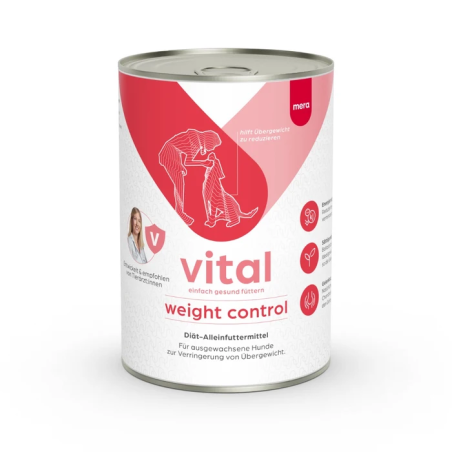 MERA Vital Dog Diet este o hrana umeda dietetica completa, destinata cainilor adulti care au nevoie de sustinere in procesul de slabire sau pentru mentinerea greutatii corporale optime. Cu o reteta conceputa special pentru reducerea greutatii, aceasta conserva contine ingrediente echilibrate energetic si bogate in fibre, oferind senzatie de satietate fara aport caloric excesiv.