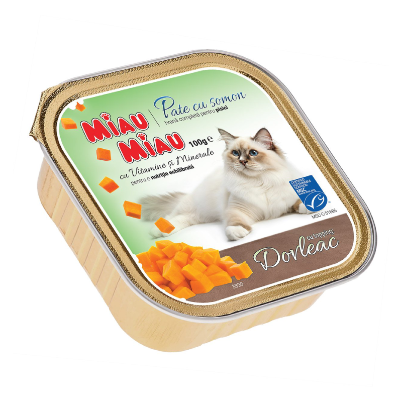 Miau Miau Pate Pisica cu Somon si Topping Dovleac 100g este o hrana umeda completa, special creata pentru pisicile adulte.