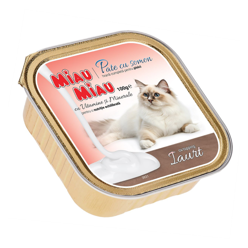 Miau Miau Pate Pisica cu Somon si Topping Iaurt 100g este o hrana umeda completa pentru pisici adulte, cu pate fin de somon si un topping cremos pe baza de iaurt.