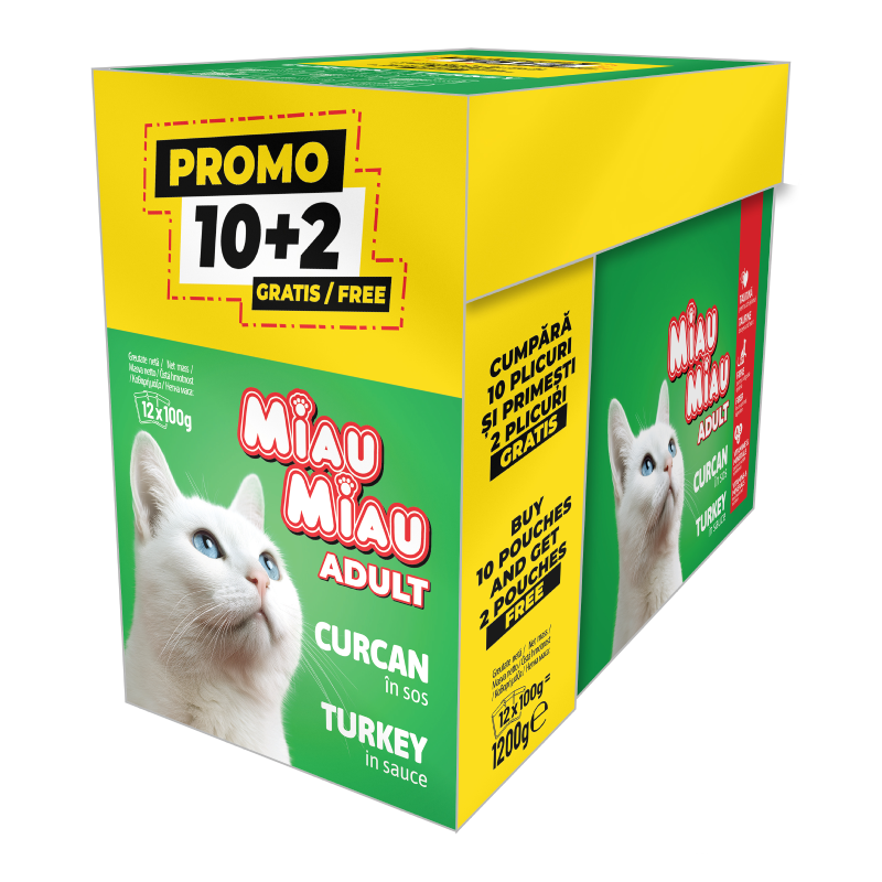 Miau Miau Adult Curcan in Sos 12x100g este o hrana umeda completa destinata pisicilor adulte, preparata din bucatele fragede de carne de curcan in sos delicios.