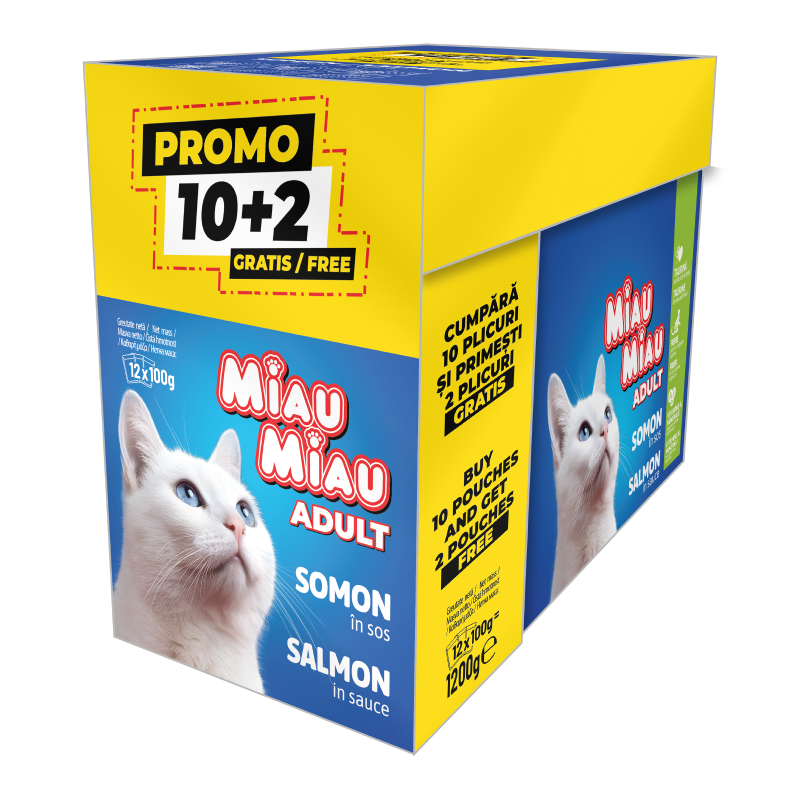 Miau Miau Adult Somon in Sos 12x100g este o hrana umeda completa pentru pisici adulte, preparata din bucati fragede de carne de somon in sos delicios.