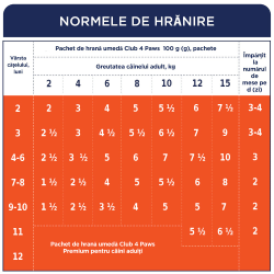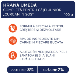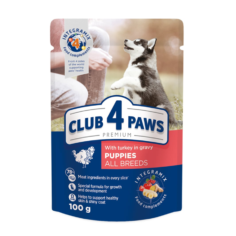 Hrana umeda Premium Club4Paws contine 78% carne si ingrediente din carne in fiecare bucata, plus o formula speciala de crestere cu un continut ridicat de curcan (25%) pentru o dezvoltare sanatoasa in primele 12 luni de viata.