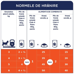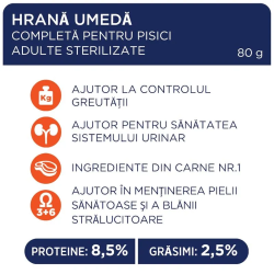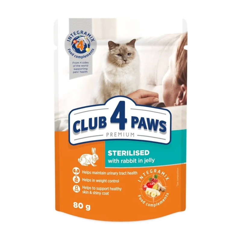 Hrana umeda Club4Paws Premium Sterilised contine 75% carne, inclusiv 10% iepure, si are un raport echilibrat proteine-grasimi care ajuta la mentinerea greutatii optime a pisicilor sterilizate.