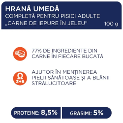 Hrana Premium contine 77% carne si ingrediente din carne, cu jeleu delicios, Omega 3 si 6 pentru piele sanatoasa si blana stralucitoare, imbogatita cu INTEGRAMIX pentru imunitate si sanatate generala.