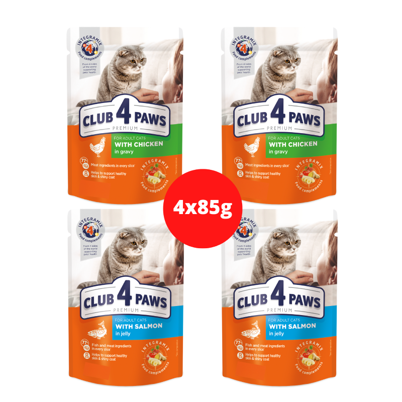 Contine 4 plicuri a cate 85 g (2x gaina in sos, 2x somon in jeleu)