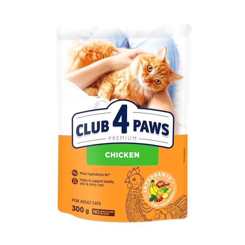 Pui 26%, porumb, orez, gluten de porumb, grasimi de origine animala (cu tocoferoli), proteine hidrolizate de origine animala, pulpa de sfecla, minerale, ulei de somon 0,5%, drojdii de bere, seminte de in 0,27%, banane* 0,23%, tomate* 0,2%, paducel* 0,065%, ghimbir* 0,01%.