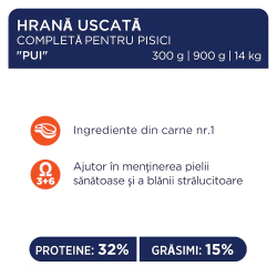 Hrana premium uscata contine in principal ingrediente din carne, inclusiv carne de pui (26%), care are un coeficient ridicat de digestibilitate – pana la 80%.