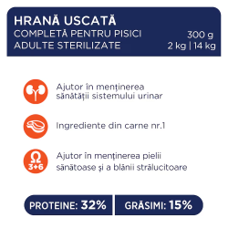 Hrana uscata premium este formulata special pentru a raspunde nevoilor nutritionale ale pisicilor adulte dupa sterilizare sau castrare.