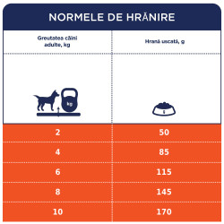 a se pastra intr-un loc uscat si racoros, ferit de soare. hrana trebuie introdusa treptat in alimentatia animalului, pe o perioada de cel putin 5 zile. asigurati acces permanent la apa potabila curata. ratiile zilnice pot varia in functie de varsta, rasa si nivelul de activitate al cainelui. cantitatea recomandata este indicata in tabelul de hranire.