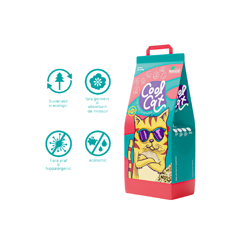 Asternut clumping sub forma de granule, special conceput pentru pisici cu par scurt.
