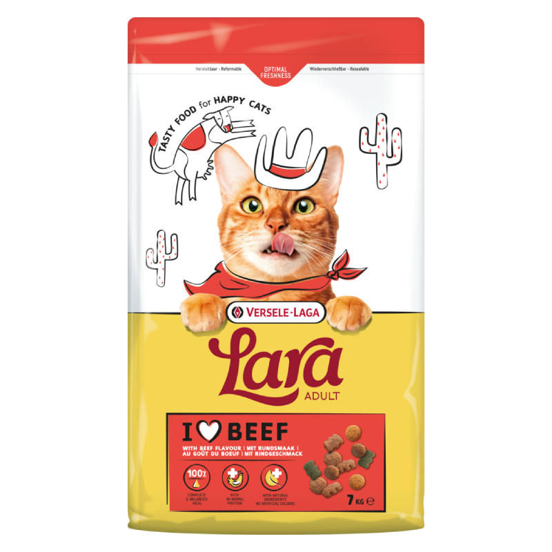 Lara Adult cu aroma de vita este o hrana uscata completa pentru pisici adulte, conceputa pentru a acoperi nevoile nutritionale zilnice ale acestora.