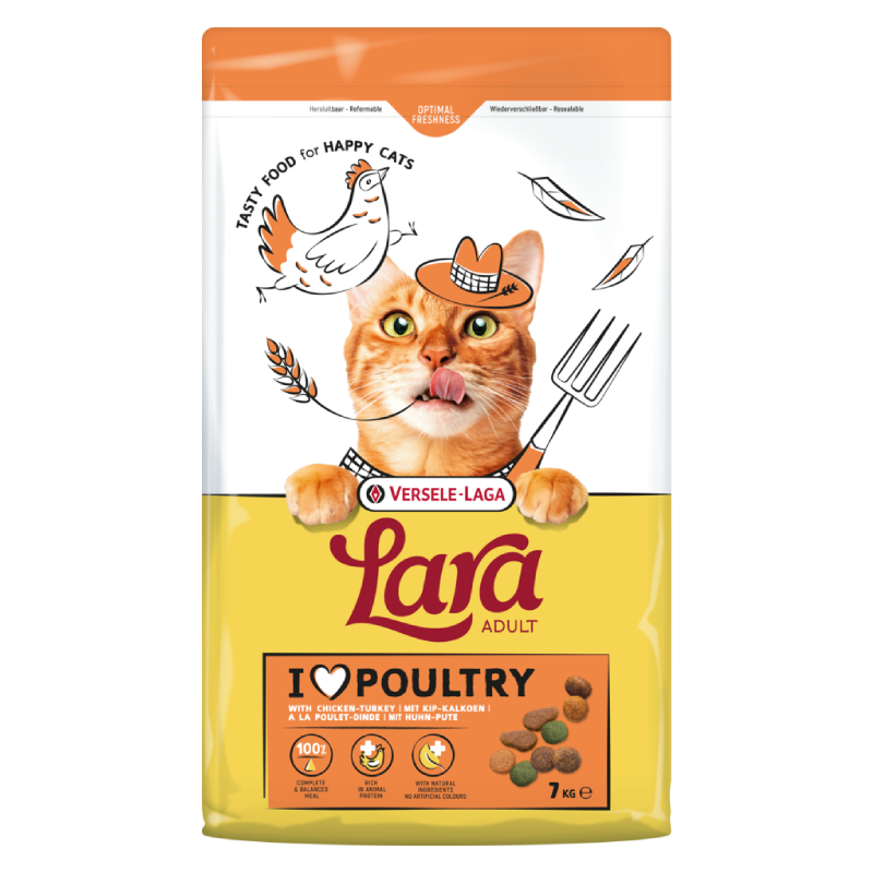 Lara Adult cu pui si curcan este o hrana uscata completa si echilibrata, special creata pentru pisicile adulte (peste 1 an).