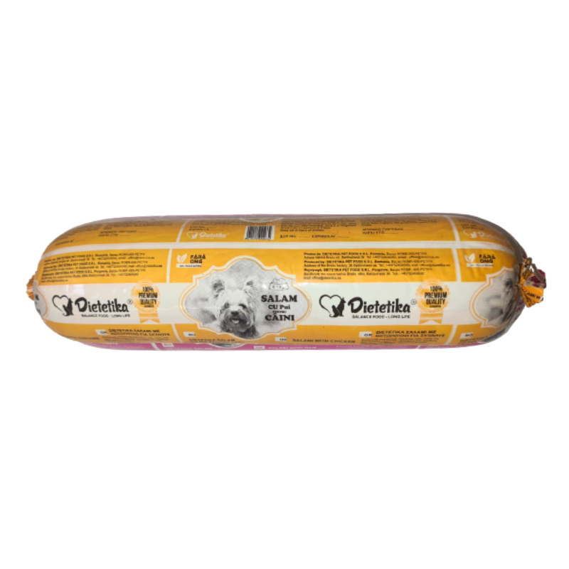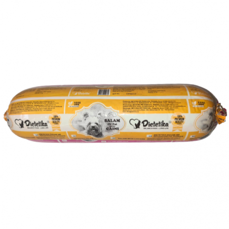 Salamul Dietetika este varianta practică de ambalare și prezentare a hranei umede pentru câini, pentru ca se păstreaza foarte bine, este ușor de folosit si de porționat. Este fabricat din multa carne de porc, amestecată cu condimente si legume. Pentru cainele tau, indiferent de rasa sau talie, salamul va reprezenta o masă delicioasă. Salamul cu șuncă pentru câini este un produs din carne care rezista mai mult timp la temperatura camerei fără să se altereze.
